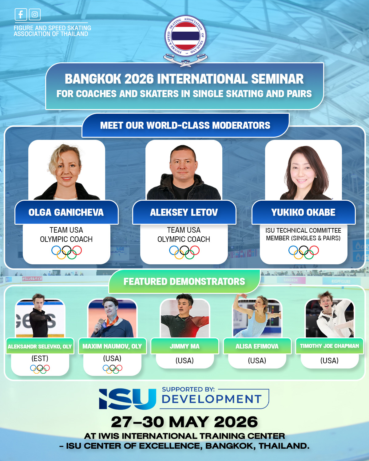 Bangkok 2026 International Seminar for Coaches and Skaters in Single Skating and Pairs will take place from 27–30 May 2026 at IWIS International Training Center - ISU Center of Excellence, Bangkok, Thailand.